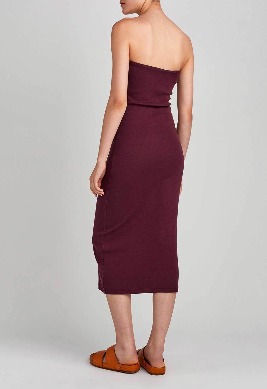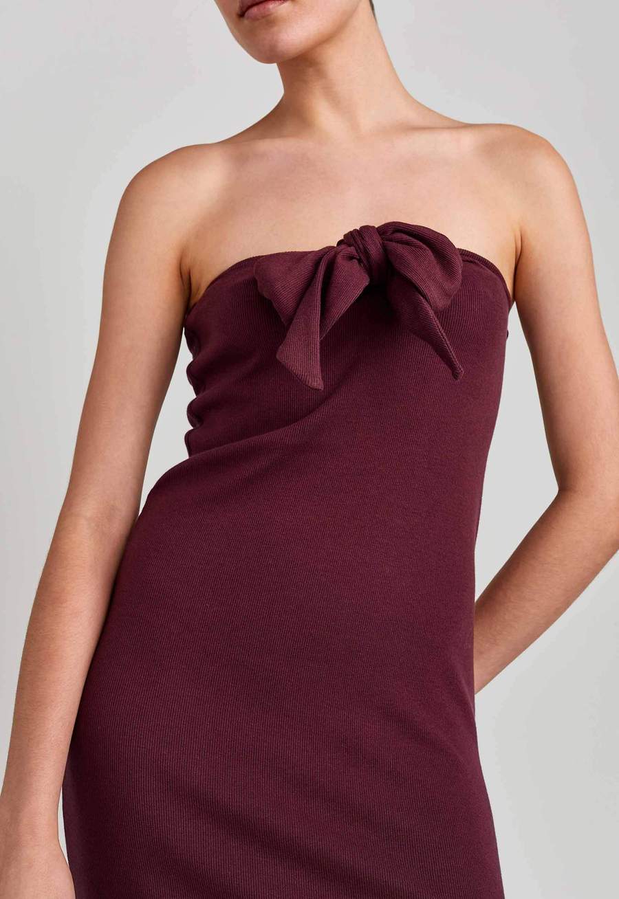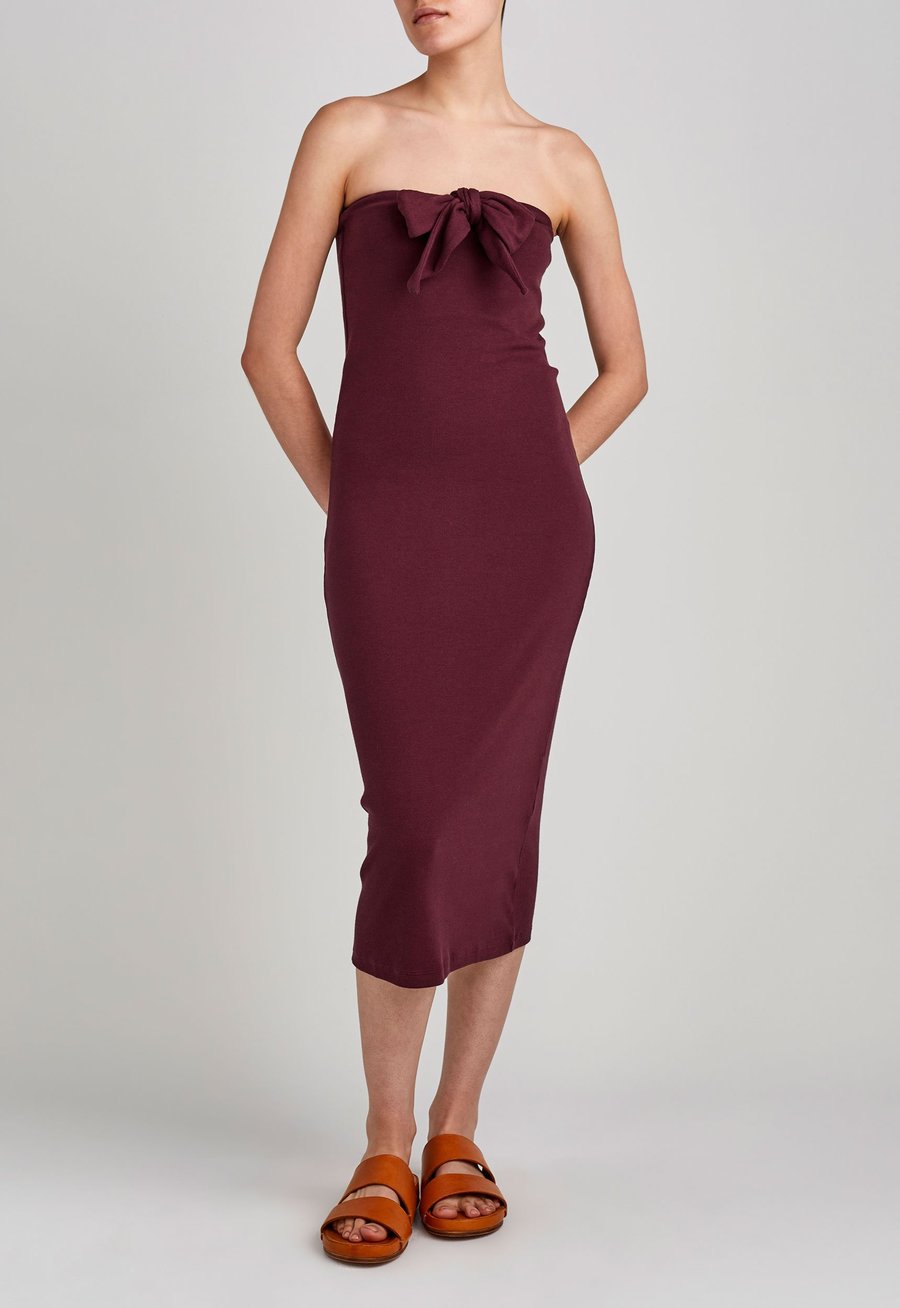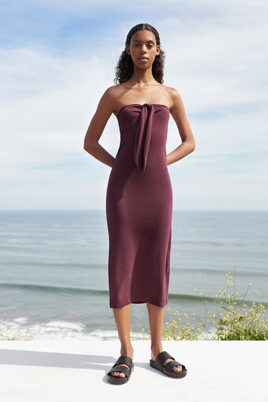 This stretch ribbed strapless dress the perfect resort update. The style is versatile in that the ties at the front may create a slightly exaggerated bow it can be tied around the neck to create a halter look.
