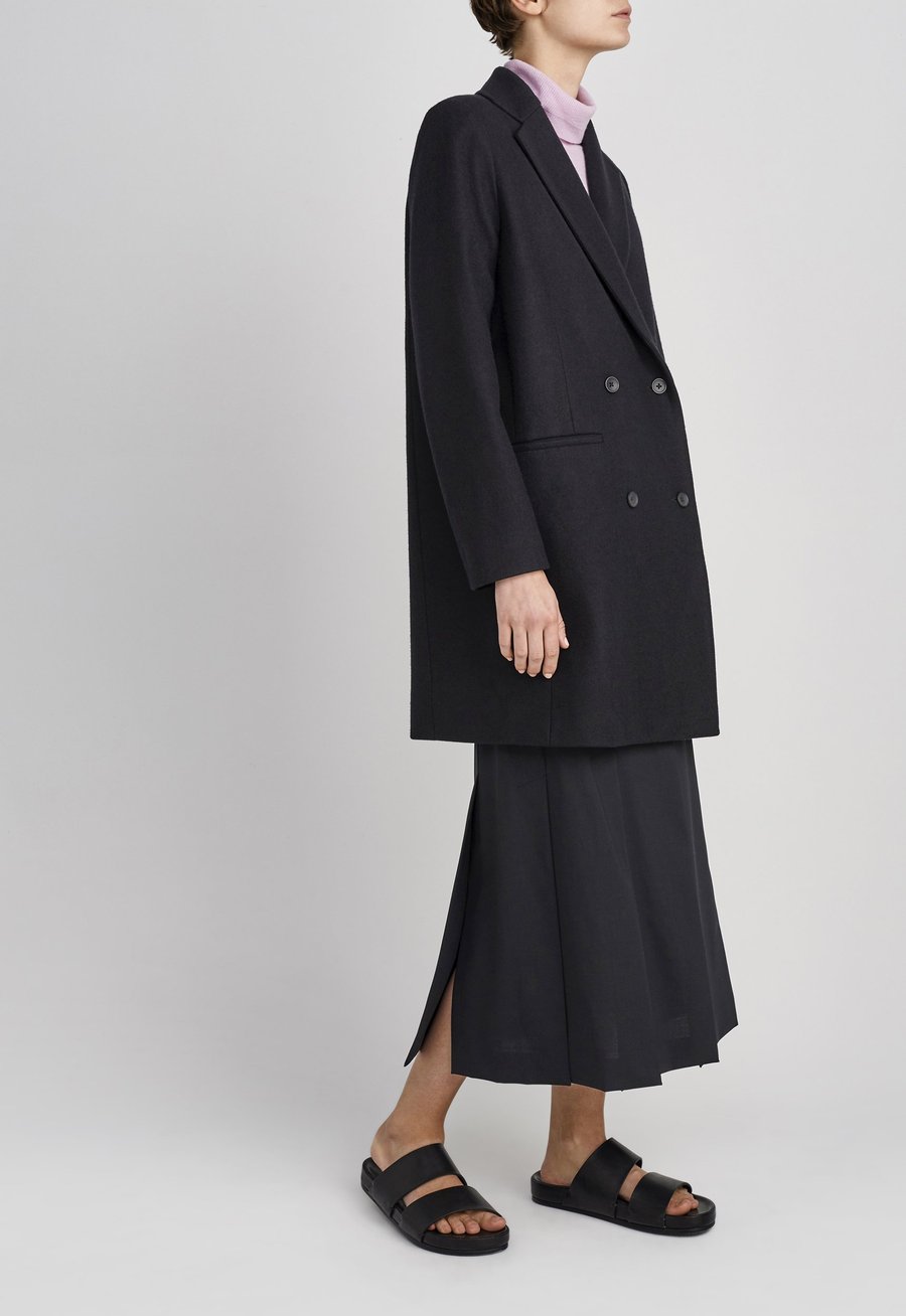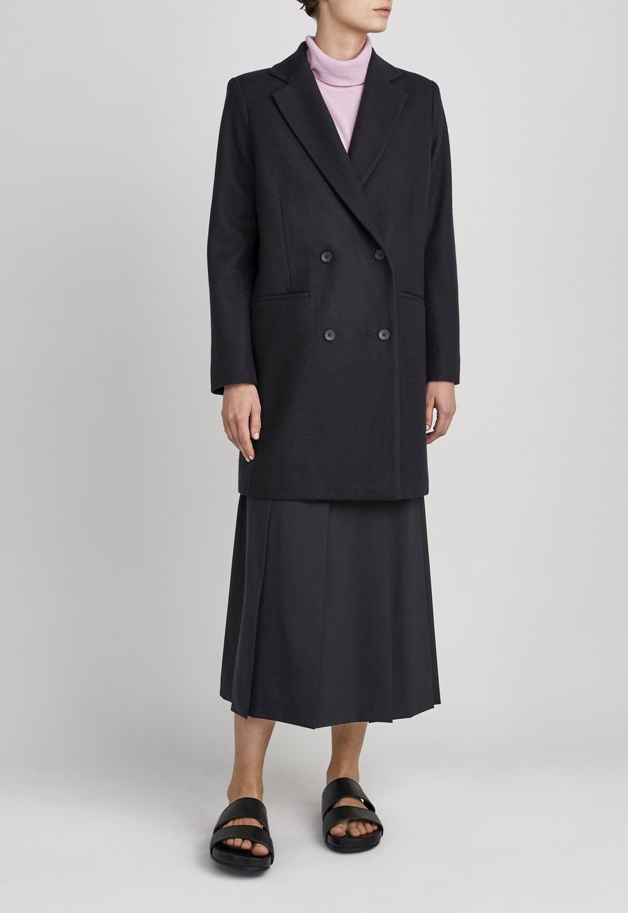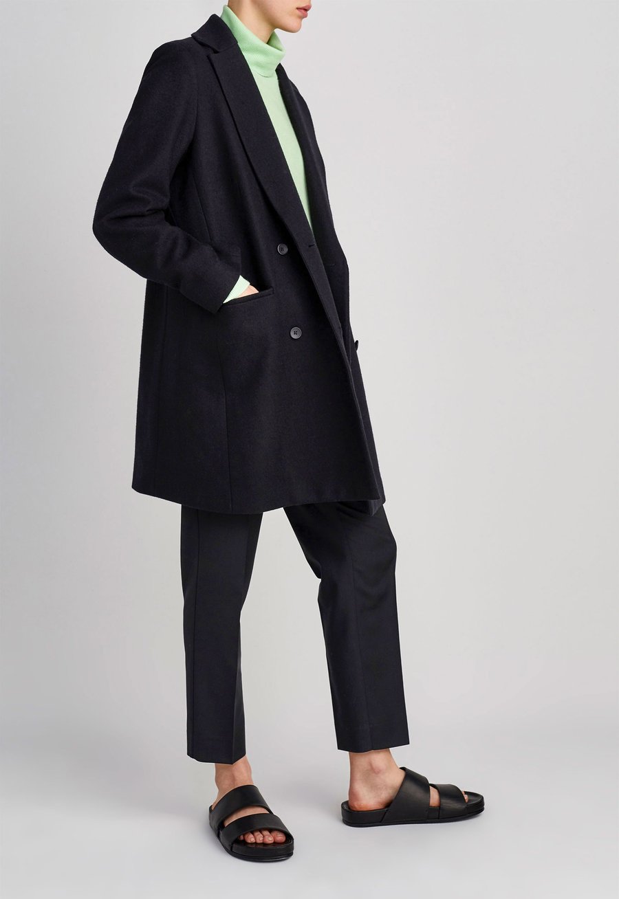 Androgynous flair. This double breasted coat is oversized in a subtle and sophisticated way. Expertly crafted in Italian Superfine Merino Wool and fully lined in satin, this style is shaped with centre front darts with details that include sleek notch lapels and welt pockets. Slip over fine knitwear, silk blouses or tee’s alike.