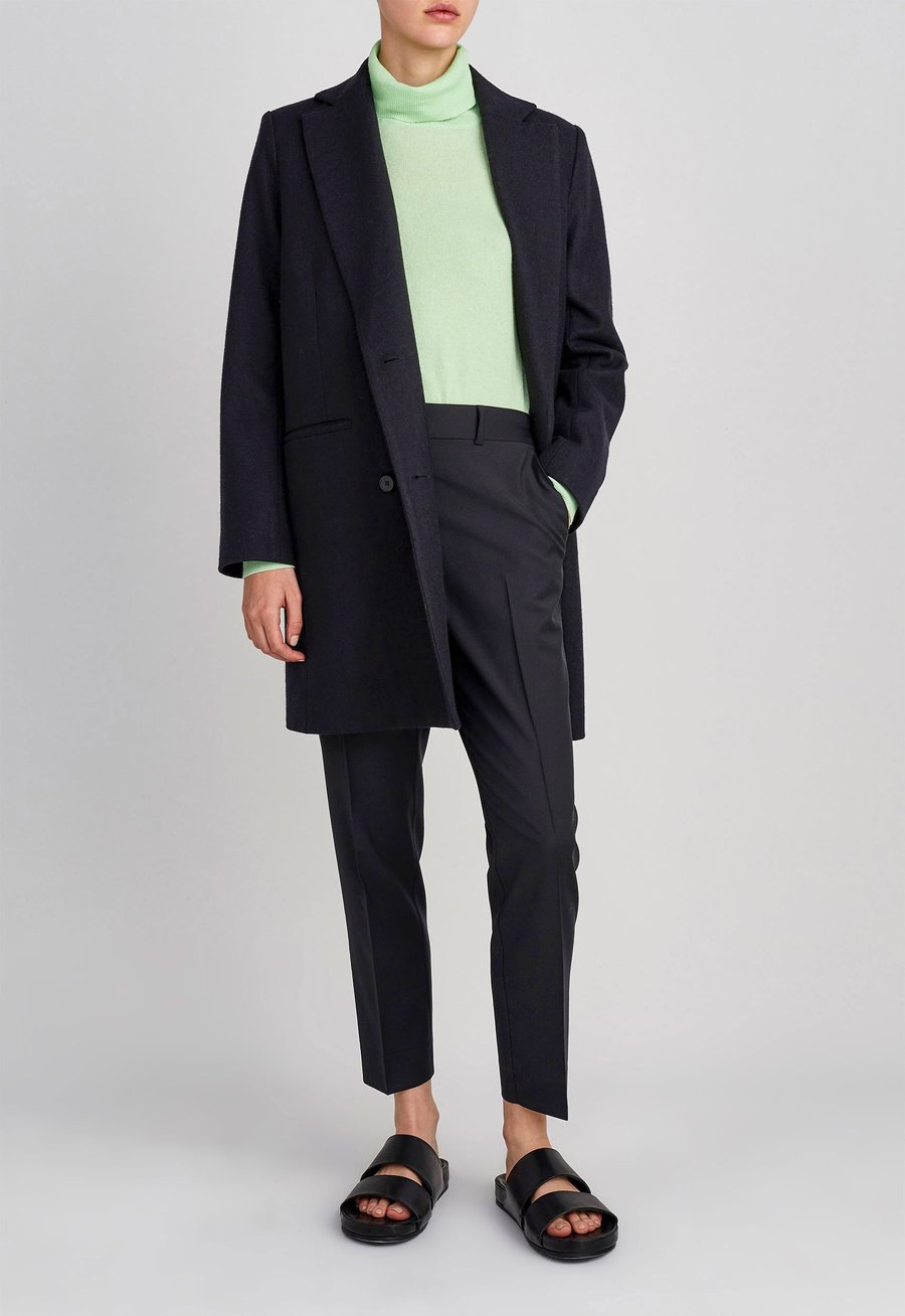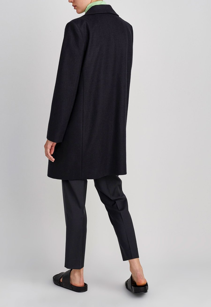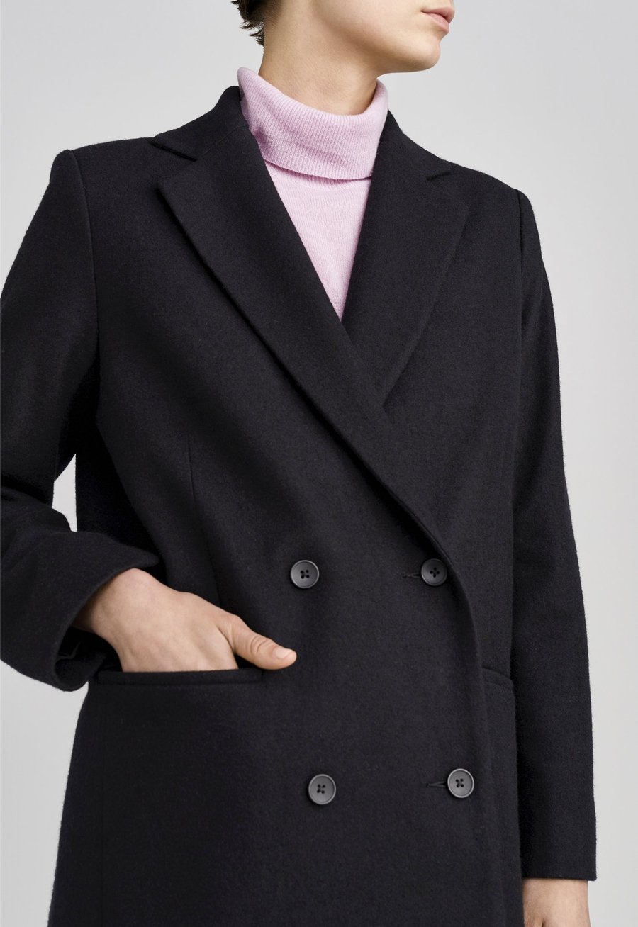 Androgynous flair. This double breasted coat is oversized in a subtle and sophisticated way. Expertly crafted in Italian Superfine Merino Wool and fully lined in satin, this style is shaped with centre front darts with details that include sleek notch lapels and welt pockets. Slip over fine knitwear, silk blouses or tee’s alike.