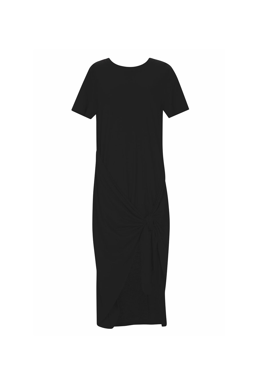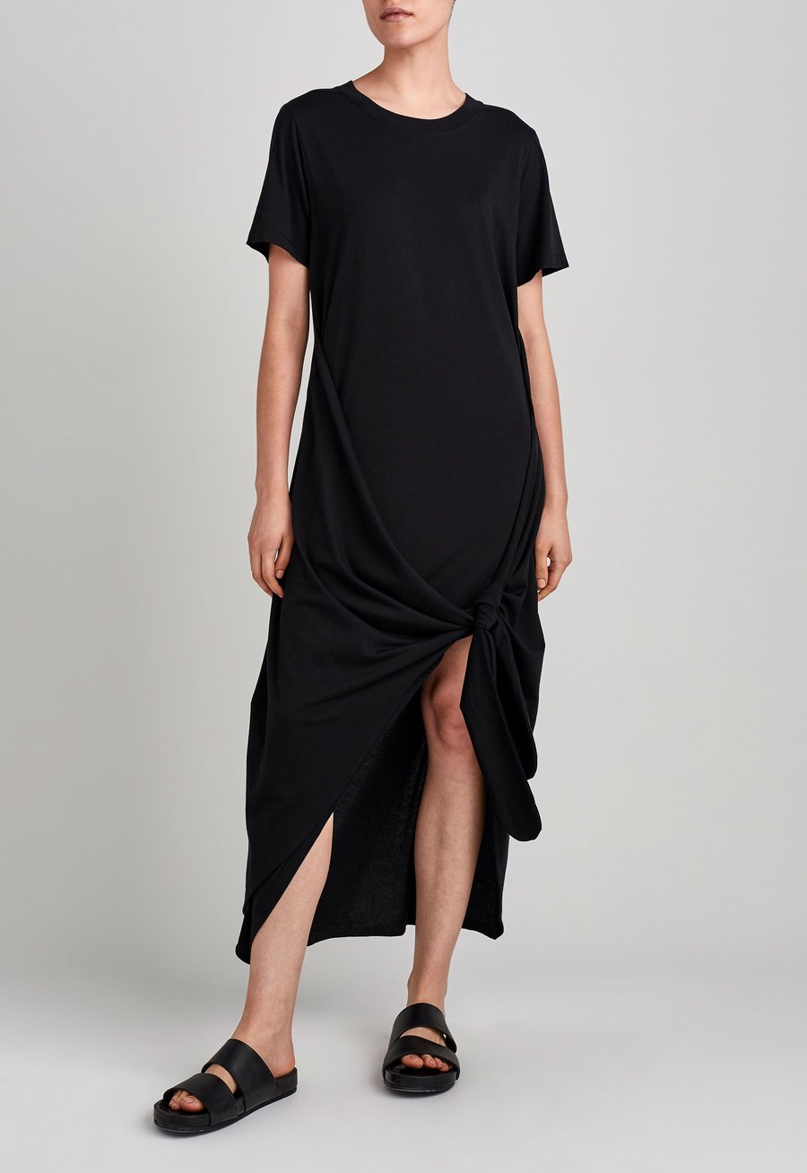 Our take on the resort jersey dress. Crafted from cotton jersey this t-shirt dress has a tie hem detail that evokes the mood of a sarong. Our jersey is over dyed and garment washed to give the style a soft, lived in hand feel. Team with your favourite summer slides and you are ready to go.