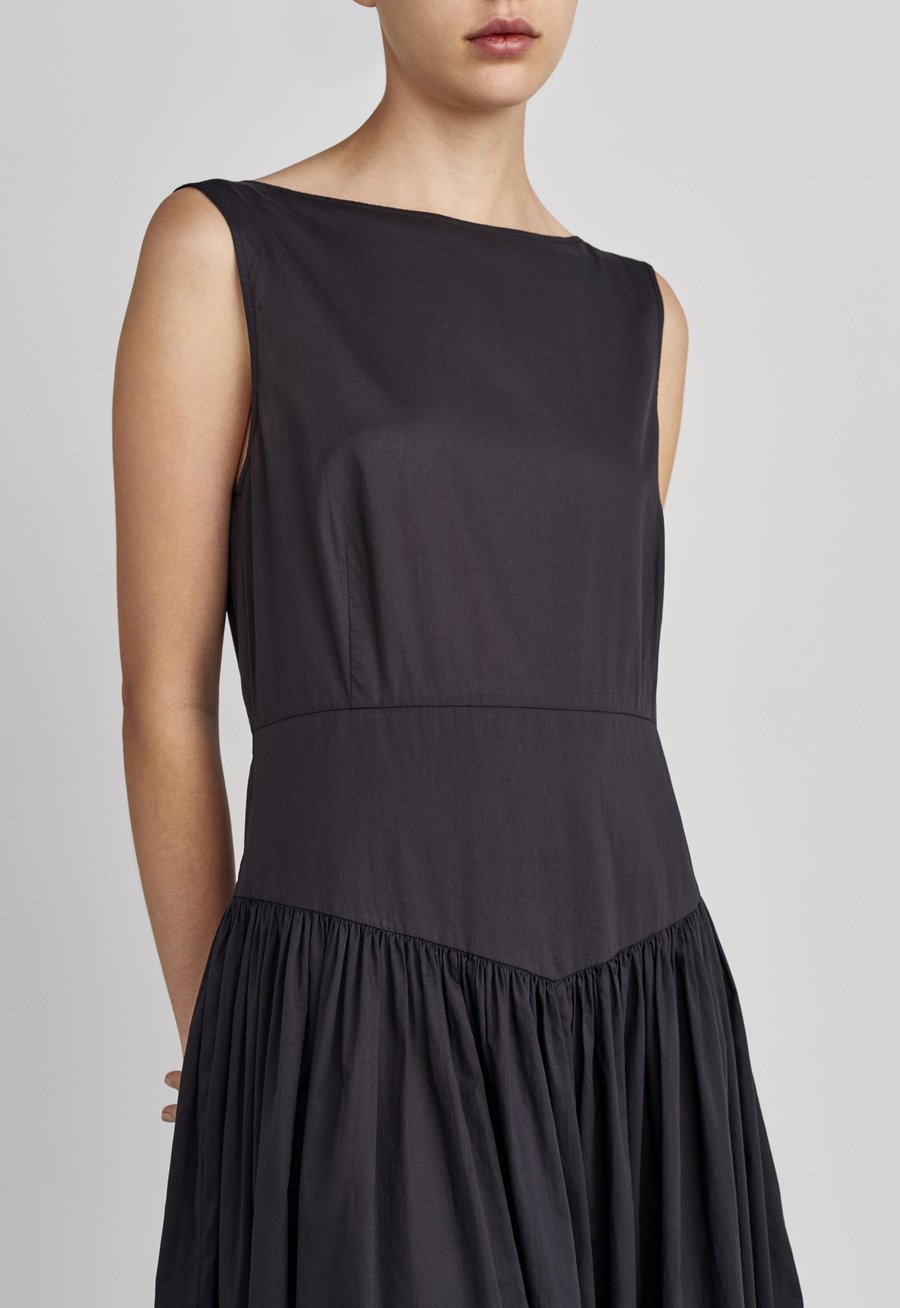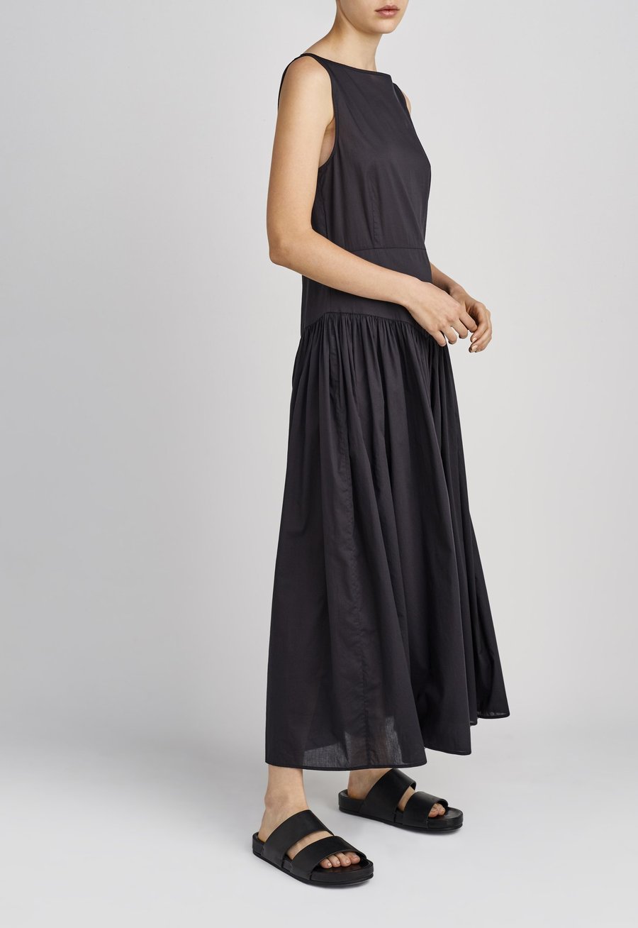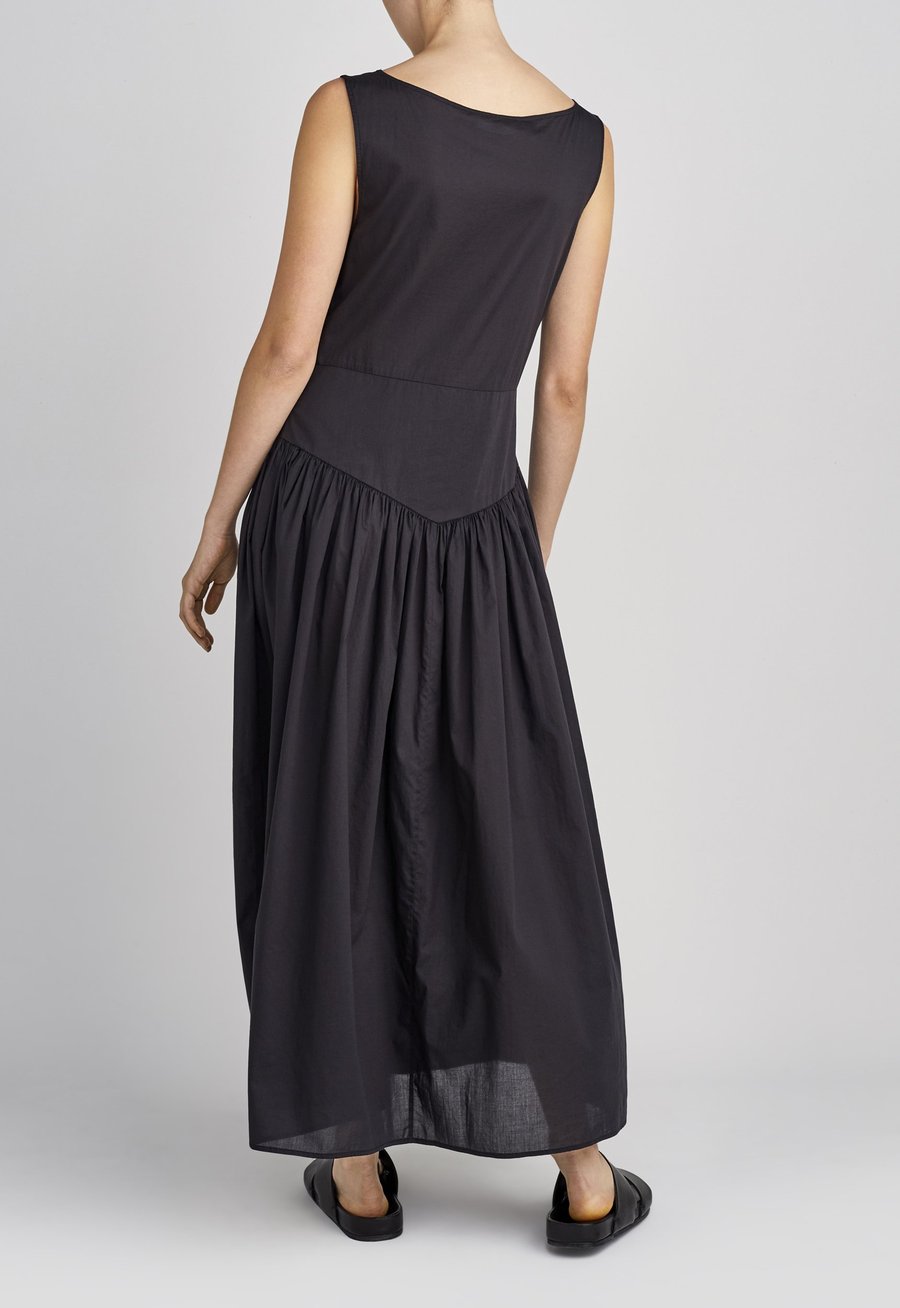 The drop waist dress receives an update. Crafted from lightweight cotton voile this sleeveless dress is cut to a neat yet relaxed fit.  The yoke panel at the waist falls to a gathered skirt that sits just above the ankle. Detailing is kept minimal with an invisible zipper at the side seam.