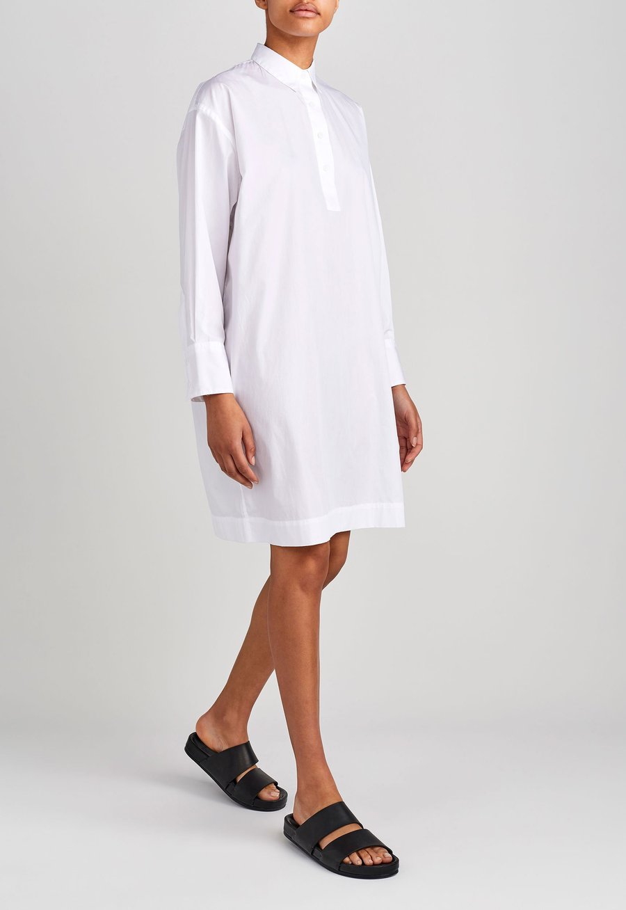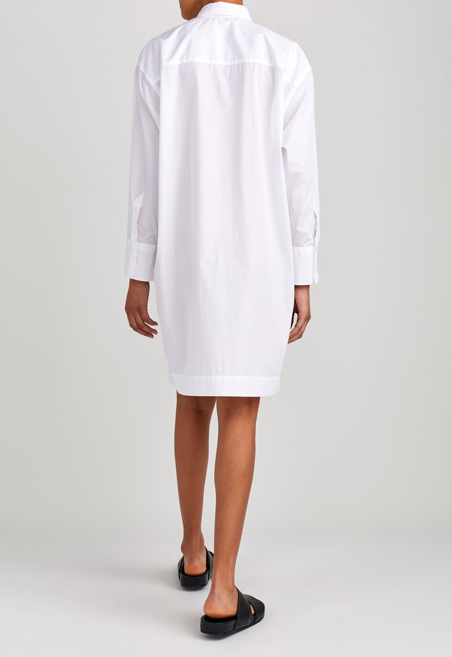 Crafted from a crisp Italian cotton poplin, this shirtdress is cut for ease and comfort. The generous proportions of the style accent a neat collar and centre front placket. Detailing is kept minimal with wide cuffs at the sleeves. This style falls gently below the knee.