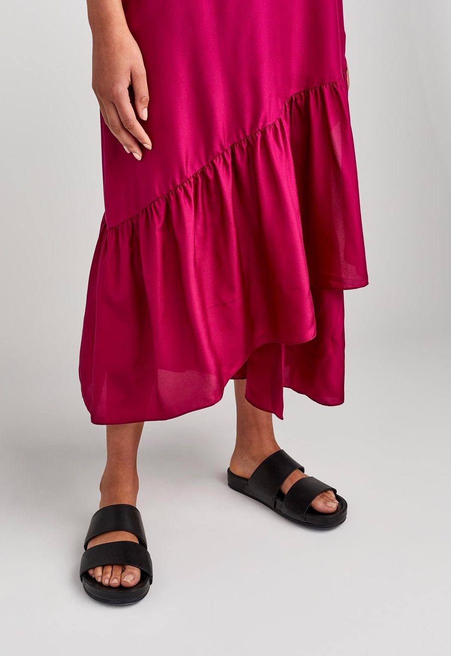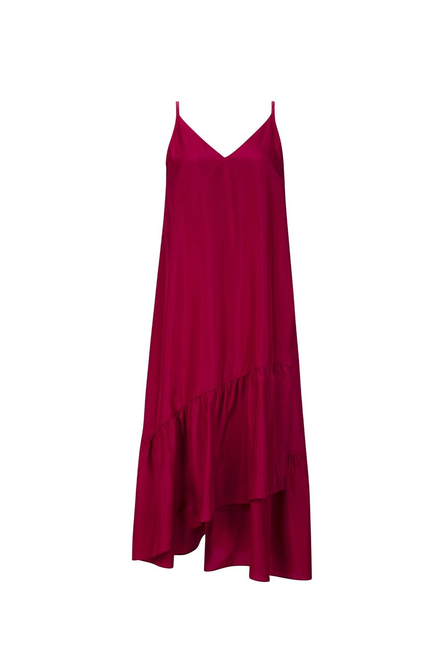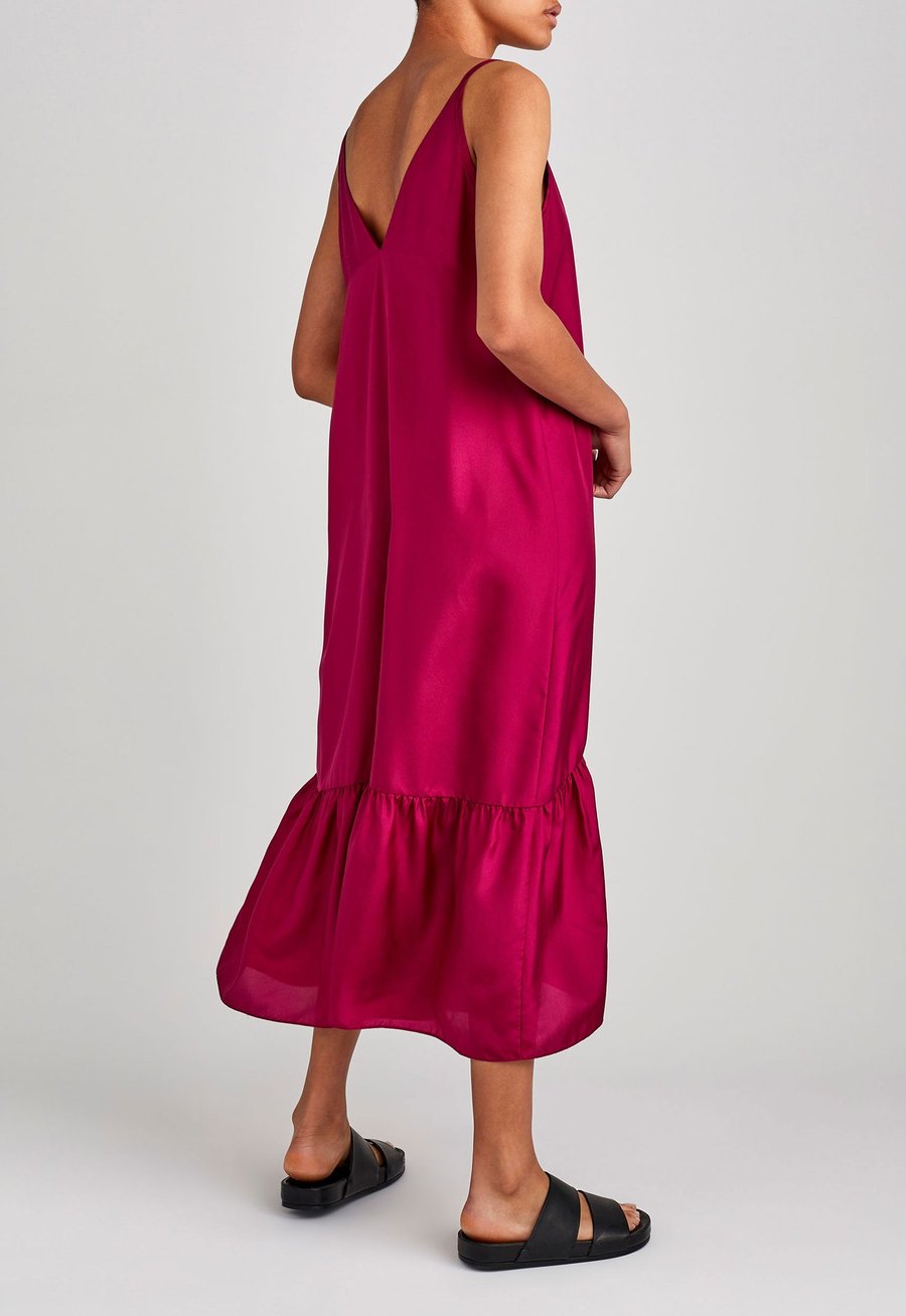 Modern romantic. This A-line dress is an easy way to stay cool while looking chic on balmy, summer days. Made from 100% silk habotai, this style is cut loose to an ankle grazing wrapped ruffle panels that float with every step. The fine shoulder straps fall to a flattering v-neck design at both the front and the back.