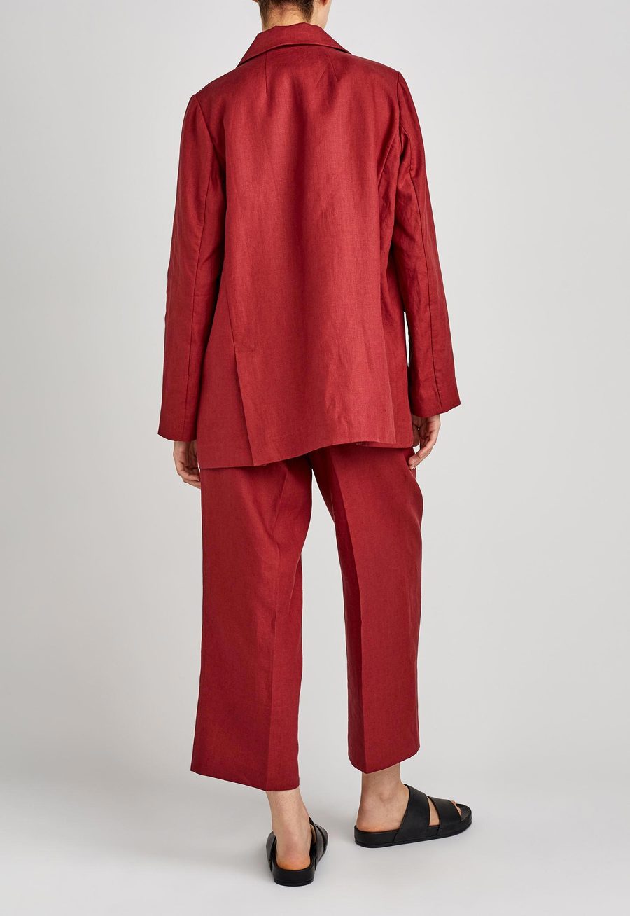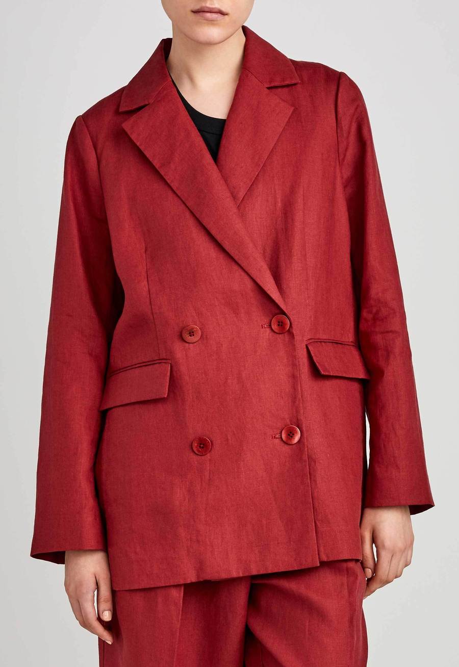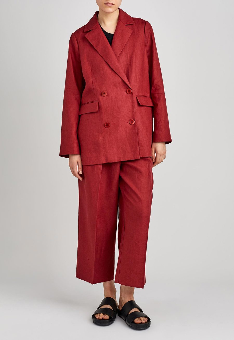 Cut for ease. This double breasted blazer is endlessly versatile. Crafted from Italian linen and tailored to an oversized silhouette that gently slouches over the shoulders. Unlined for ease and comfort - ideal for slipping over transeasonal layers. Detailing is kept modern and minimal with front pocket flats and double vents at the back. Can be worn with co-ordinating pleated trousers to make a stylish suit statement or can be easily worn back with dressier pieces.