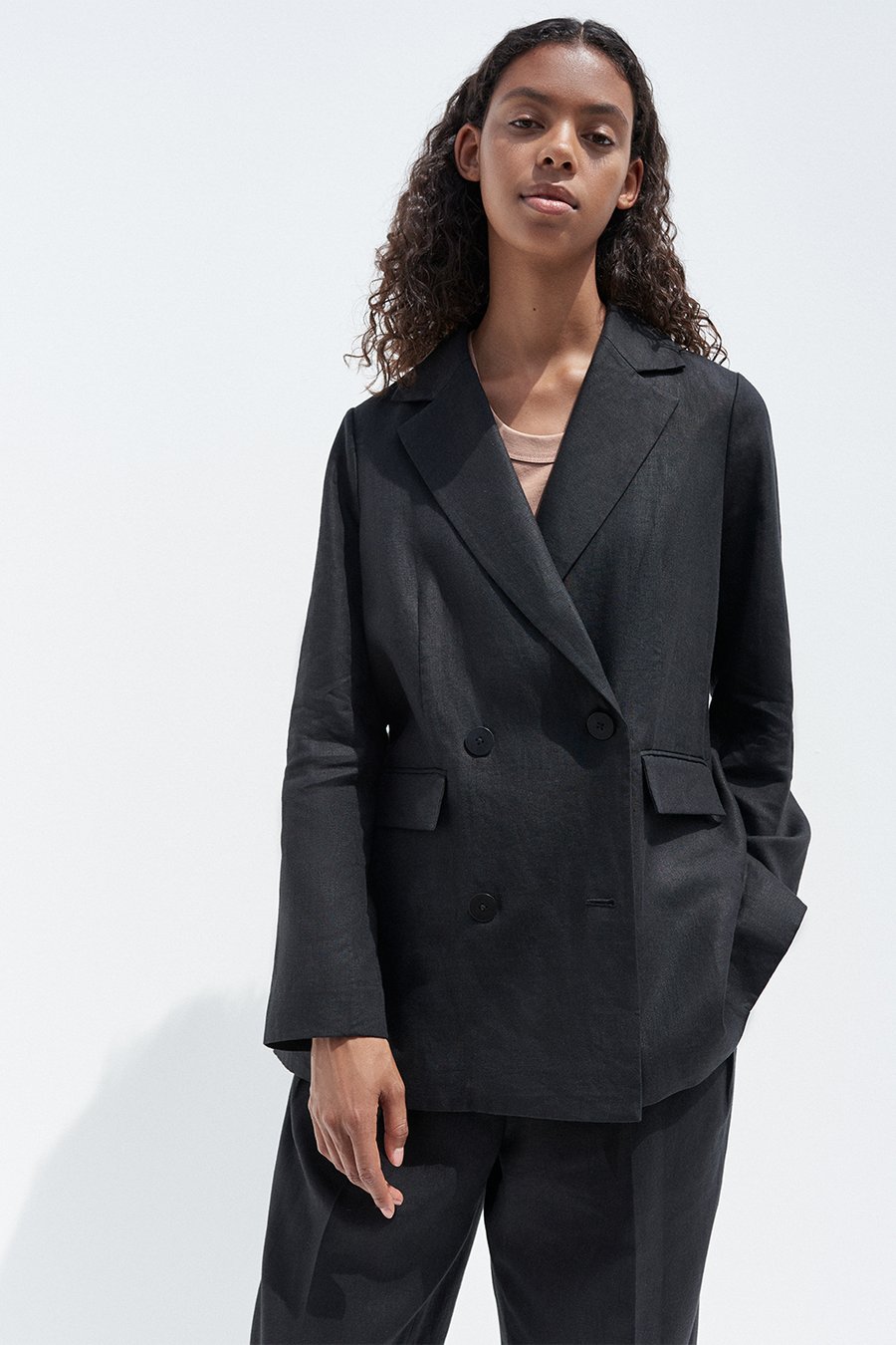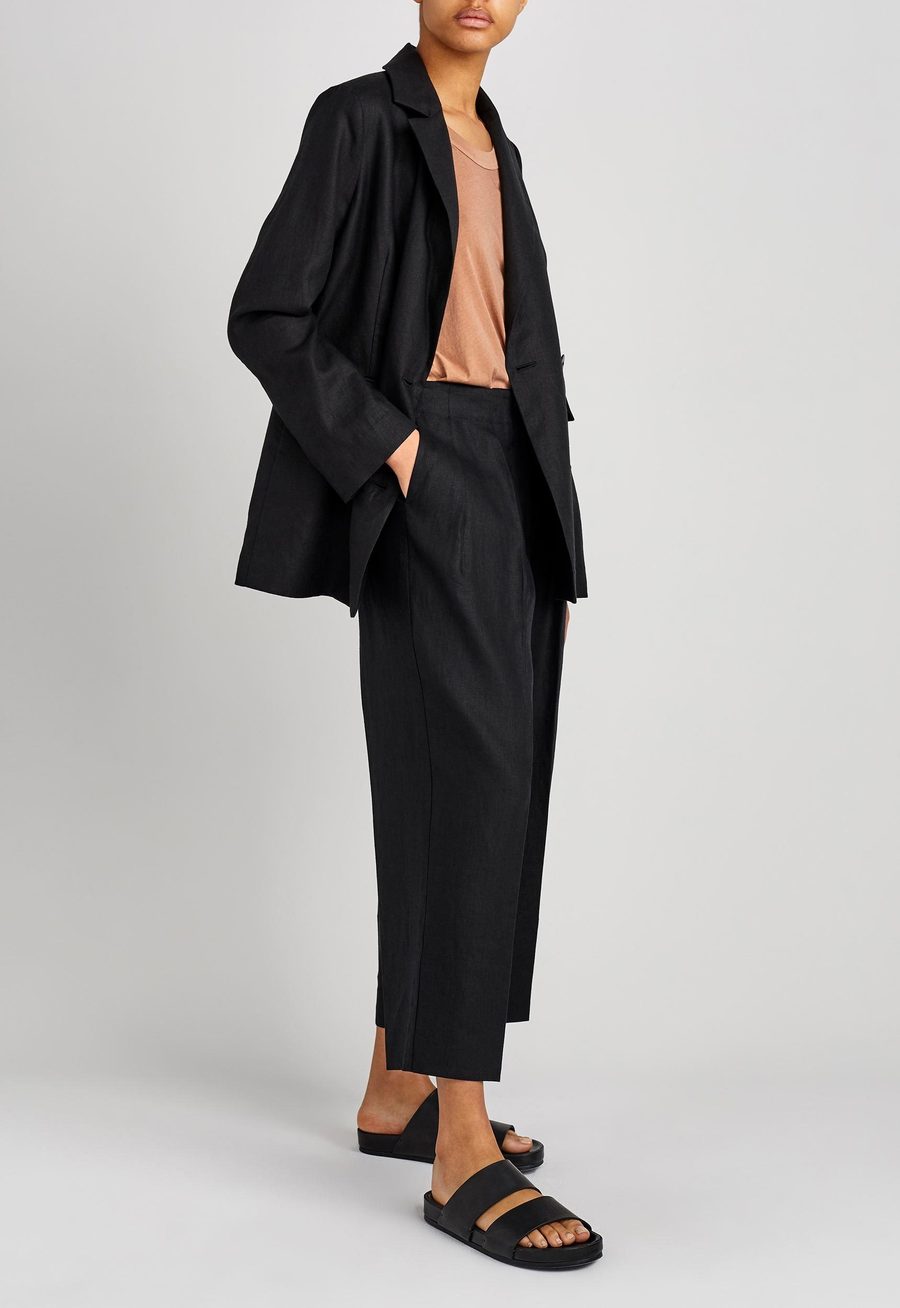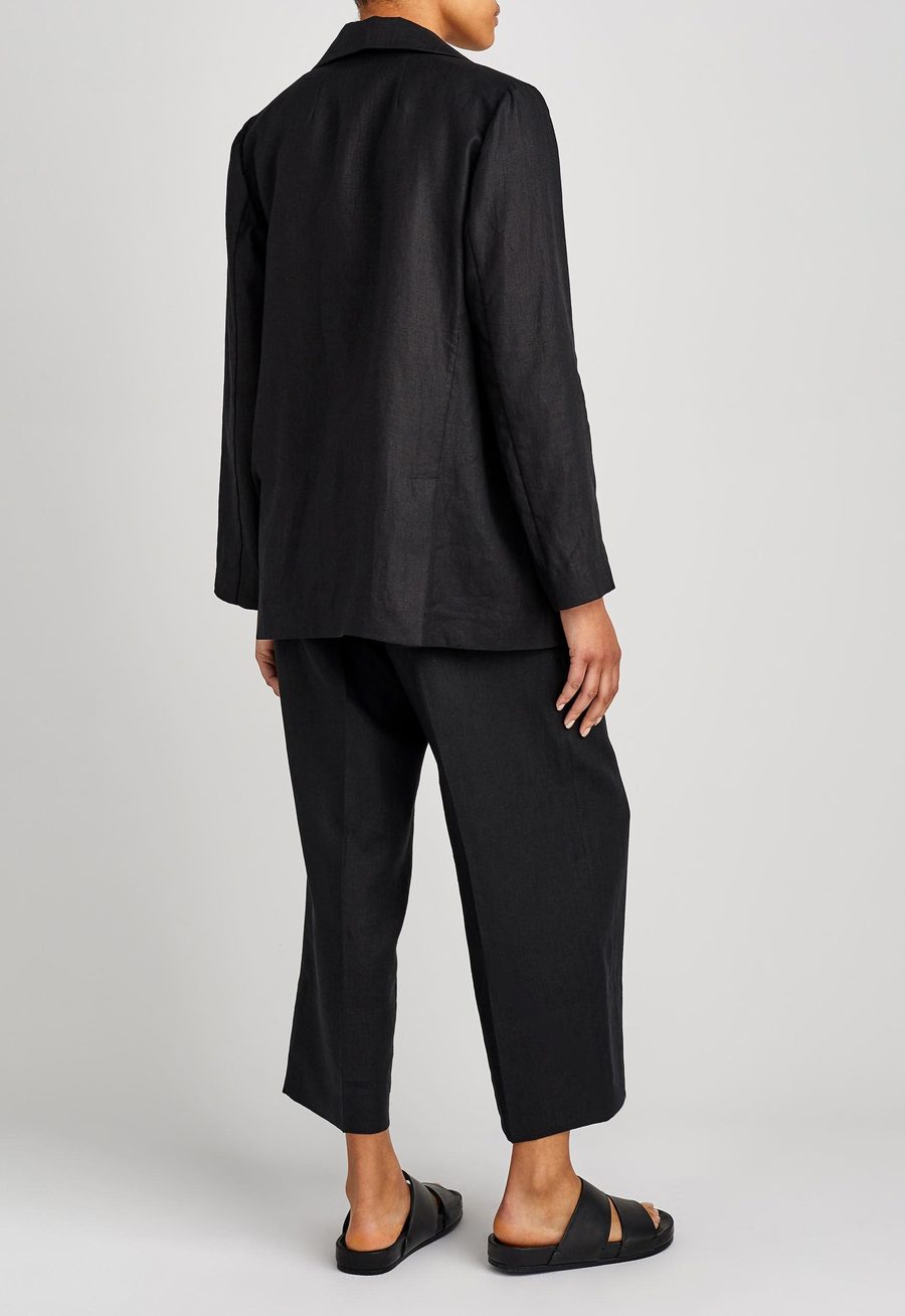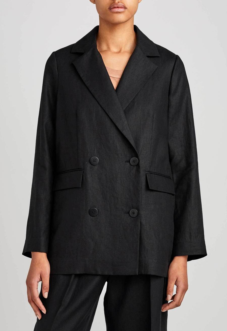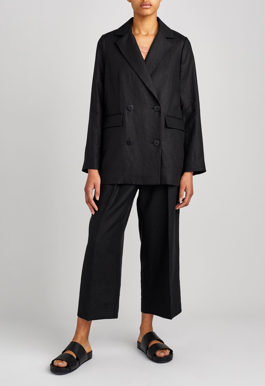 Cut for ease. This double breasted blazer is endlessly versatile. Crafted from Italian linen and tailored to an oversized silhouette that gently slouches over the shoulders. Unlined for ease and comfort - ideal for slipping over transeasonal layers. Detailing is kept modern and minimal with front pocket flats and double vents at the back. Can be worn with co-ordinating pleated trousers to make a stylish suit statement or can be easily worn back with dressier pieces.