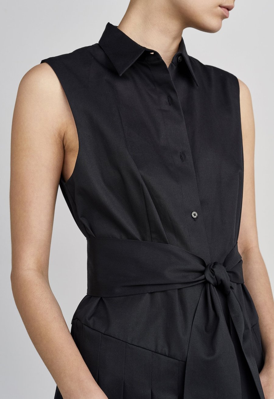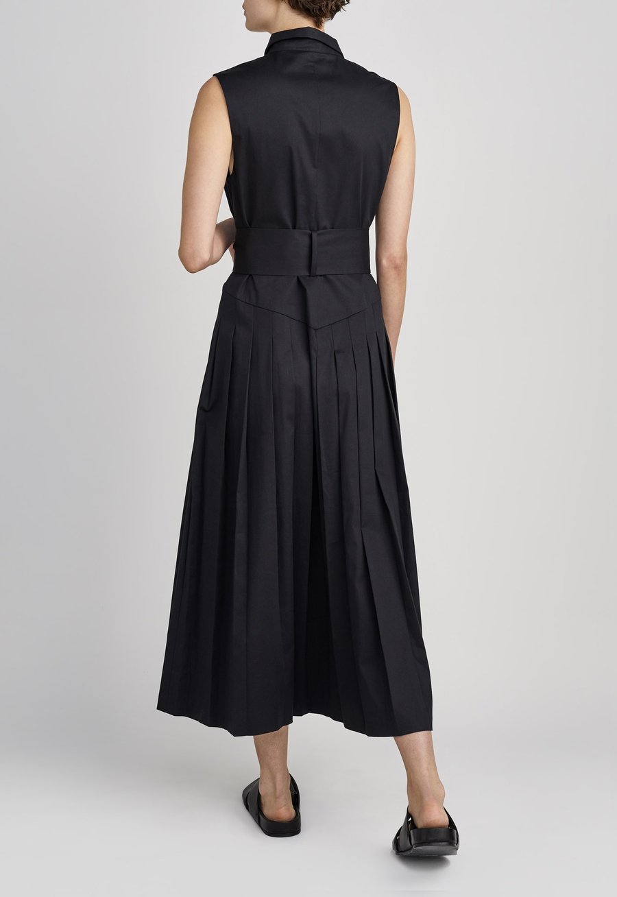 An elegant take on the sundress. This long line pleated dress is crafted from Japanese stretch cotton twill. The fitted bodice has a centre yoke that gives the skirt a drop waist look and can be cinched with a self-fabric sash. The button through styles has a neat collar that is devoid of stitching and kept very minimal in regards to detailing.