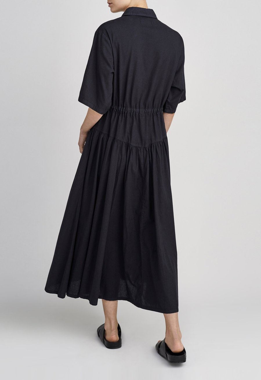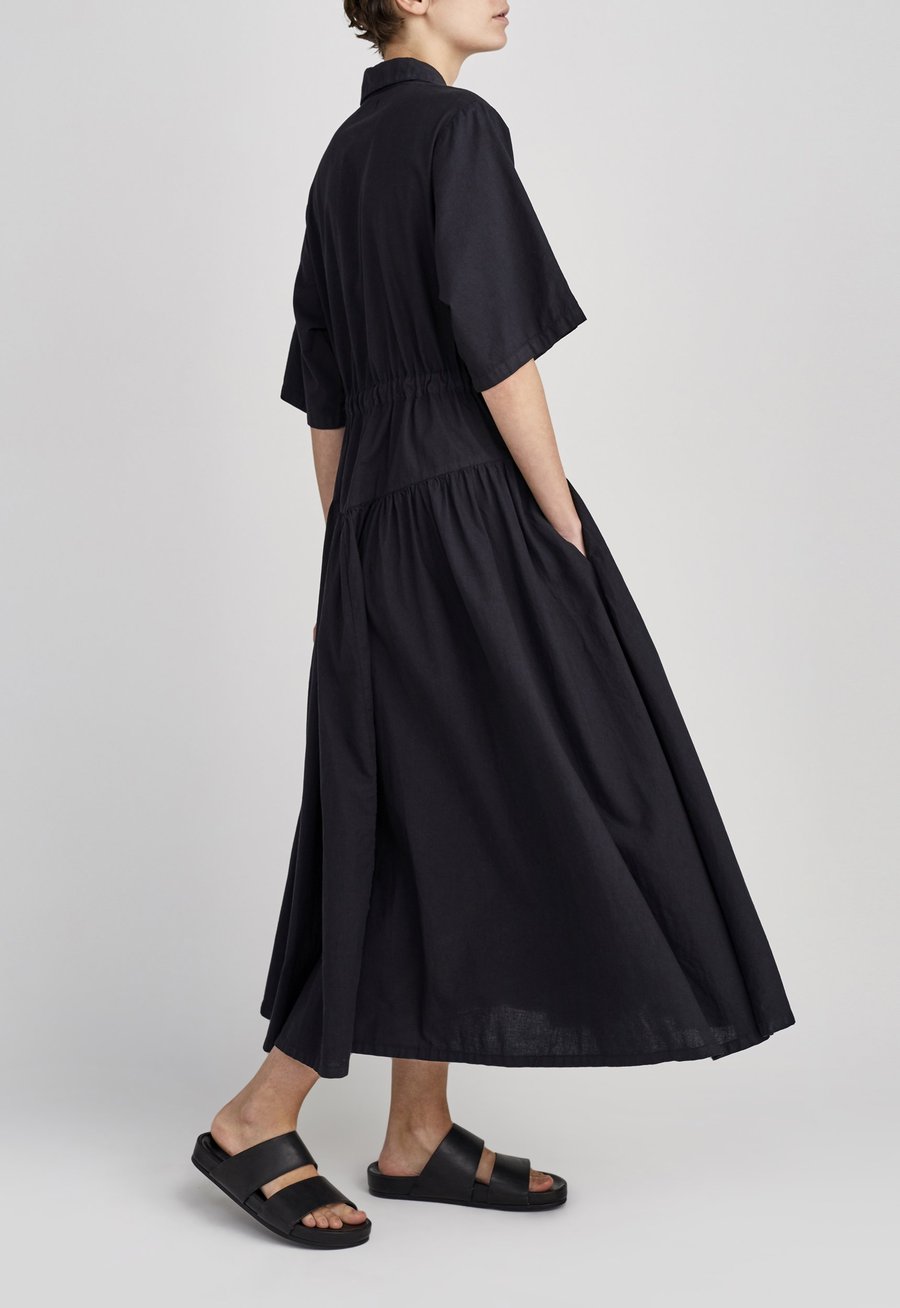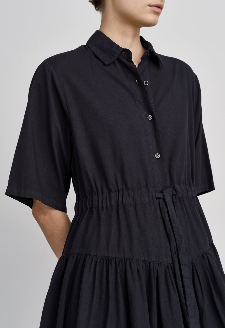 Crafted from an Italian cotton lawn, this versatile short sleeve dress in cut loose and relaxed and is designed to be cinched in at the waist be a self fabric drawstring. Details include a subtle nod to the ‘80’s with the drop waist yoke full skirt.